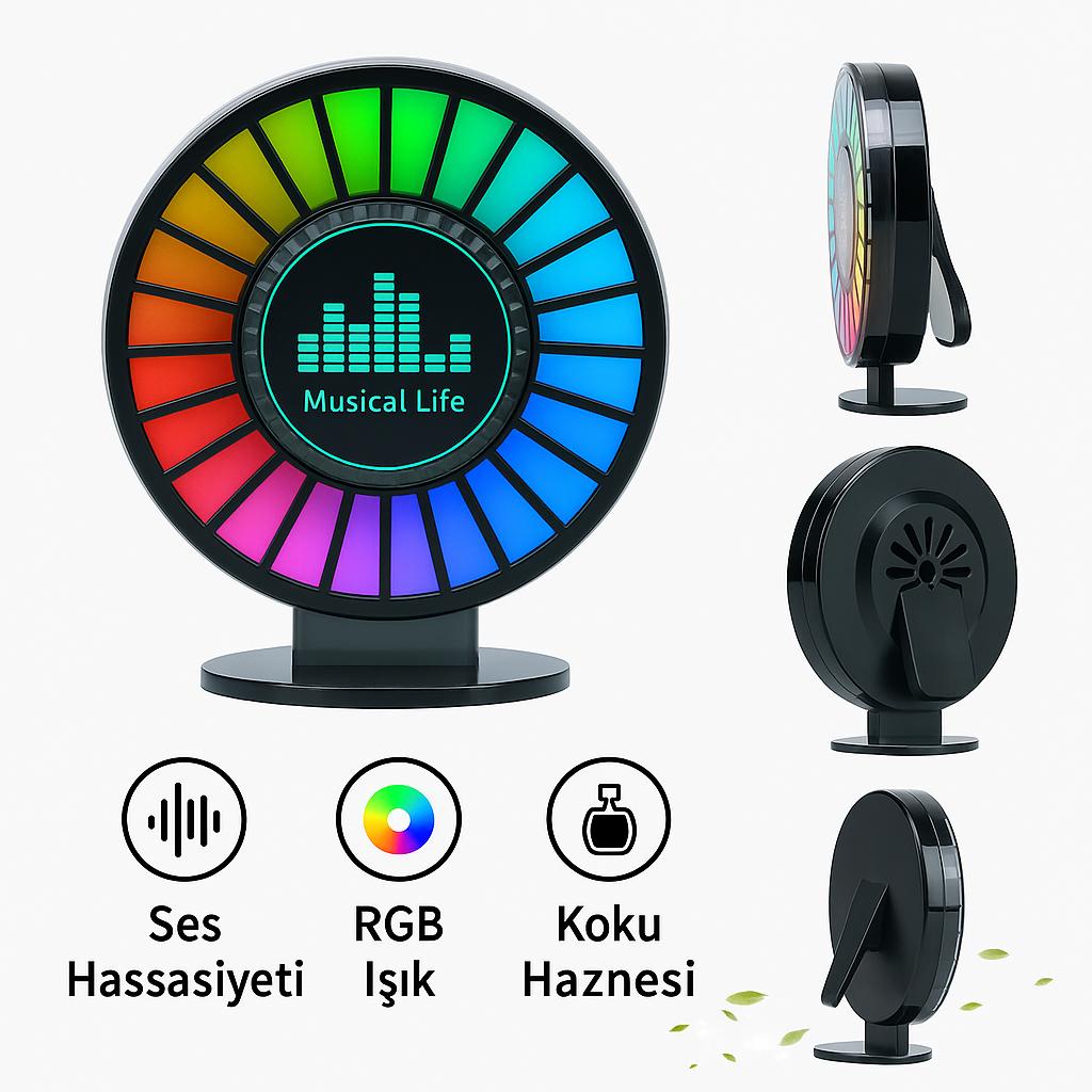 Bu koku hazneli, sese duyarlı RGB LED ışıklı klima aksesuarı, müziğe veya sese duyarlı yapısı ile araç içi ambiyansı bambaşka bir seviyeye taşır. Aynı zamanda koku haznesiyle ferah ve hoş bir hava sağlar.